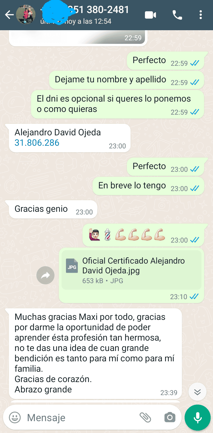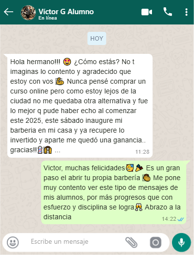 Proporciona asesoramiento permanente a través de WhatsApp y correo electrónico, brindando clases grabadas y manuales personalizados que profundizan en el conocimiento del oficio. Además, como incentivo para sus estudiantes, les proporciona un certificado, lo que les ayuda a despegar y a progresar en el futuro. Si estás buscando un mentor que te guíe en tu camino hacia el éxito en el mundo de la barbería, Maximiliano es tu instructor barbero a distancia especializado.